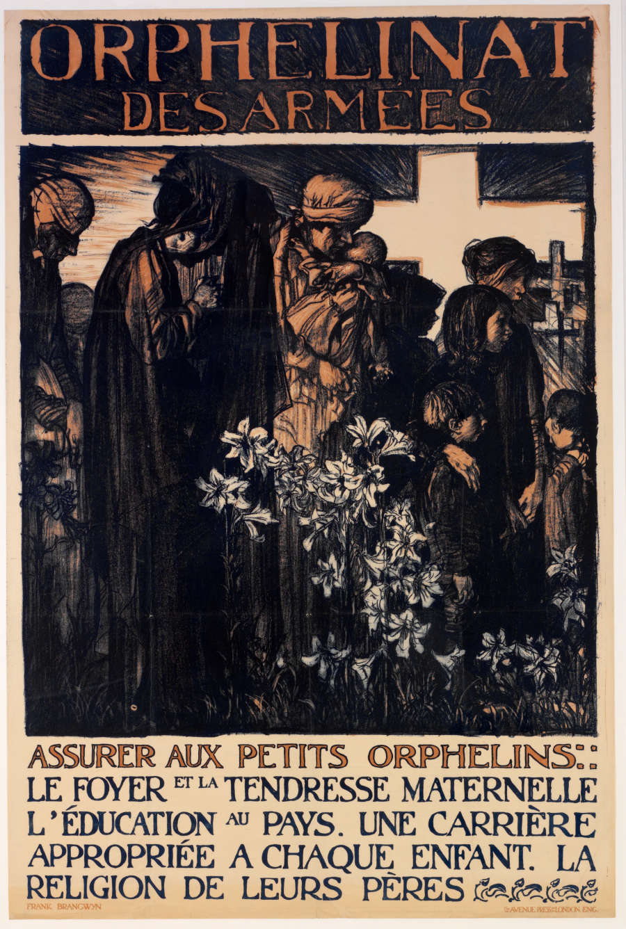 Artist printed in LL corner: "FRANK BRANGWYN"; printer name printed in LR corner: "THE AVENUE PRESS LIMITED LTD LONDON.ENG."; title printed on top: "ORPHELINAT / DES ARMÉES"; inscribed in lower quadrant: "ASSURER AUX PETITS ORPHELINS:: / LE FOYER ET LA TENDRESSE MATERNELLE / L'ÉDUCATION AU PAYS. UNE CARRIÈRE/ APPROPRIÉE A CHAQUE ENFANT. LA / RELIGION DE LEURS PÈRES"