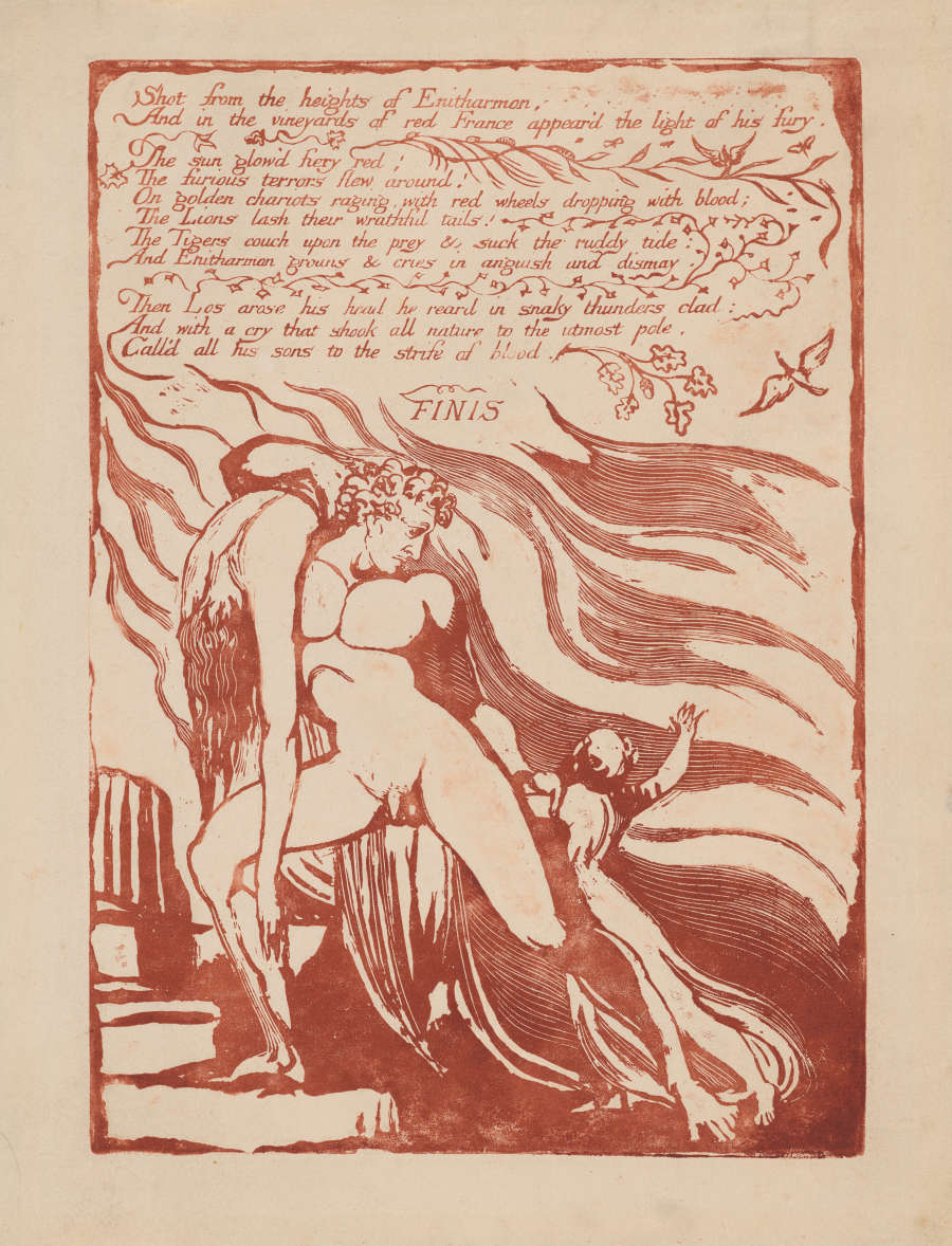 In Plate--inscribed along top:Shot from the heights of Enitharmon./And in the vineyards of red France appear'd the light of his fury./The sun glow'd fiery red:/The furious terrors flew around:/On golden chariots raging, with red wheels dropping with blood;/The Lions lash their wrathful tails!/The Tigers couch upon the prey & suck the ruddy tide:/And Enitharmon growns & cries in anguish and dismay/Then Los arose his head he reard in snaky thunders clad:/And with a cry that shook all nature to the utmost pole./Call'd all his sons to the strife of blood./FINIS