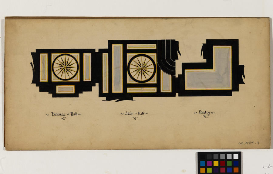 "Entrance Hall", "Stair Hall", and "Pantry" written in ink or in watercolor below image. title as above written in blue pencil on cover sheet.