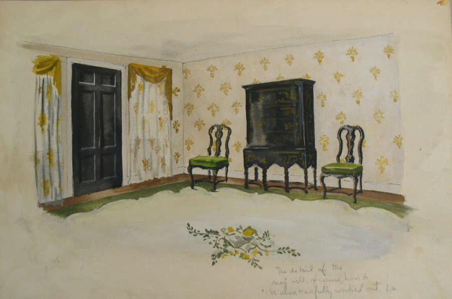in pencil script; "The detail of the rug will, of course, have to be more carefully worked out. L.M."
