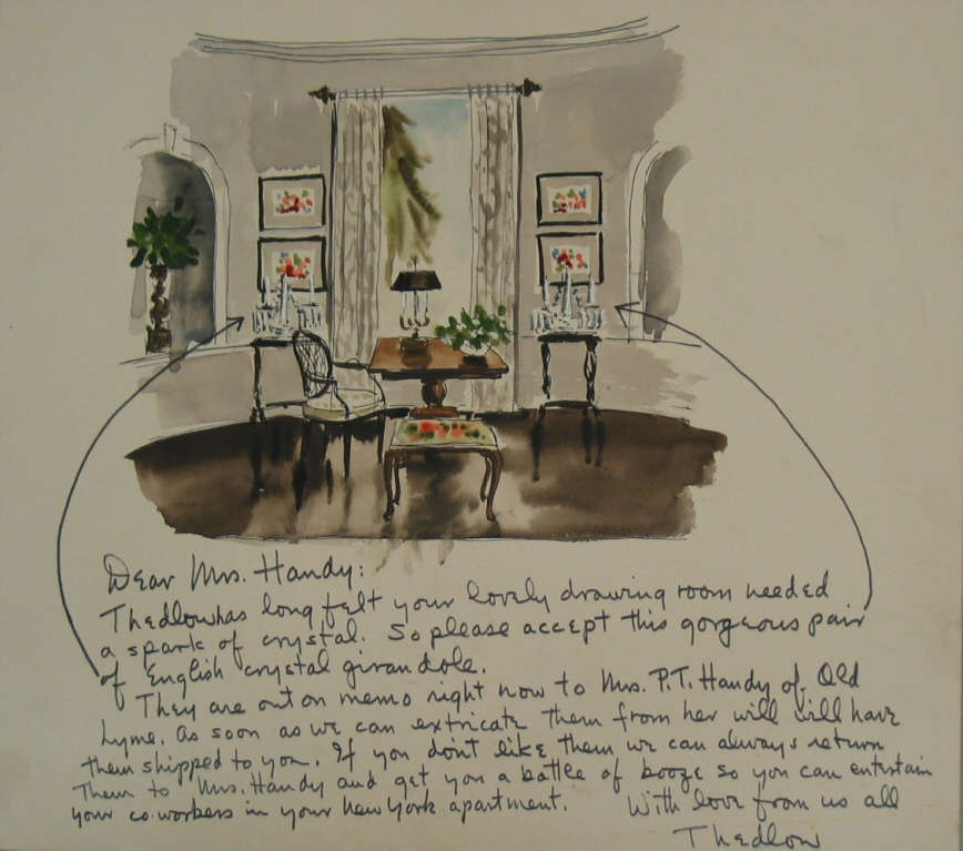 On recto in black ink: "Dear Mrs. Handy: / Thedlow has long felt your lovely drawing room needed / a spark of crystal.So please accept this gorgeous pair / of English crystal girandole. / They are out on memo right now to Mrs. P.T. Handy of Old / Lyme.As soon as we can extricate them from her will will have / them shipped to you.If you don't like them we can always return / them to Mrs. Handy and get you a bottle of booze so you can entertain / your co-workers in your New York apartment. / With love from us all / Thedlow".