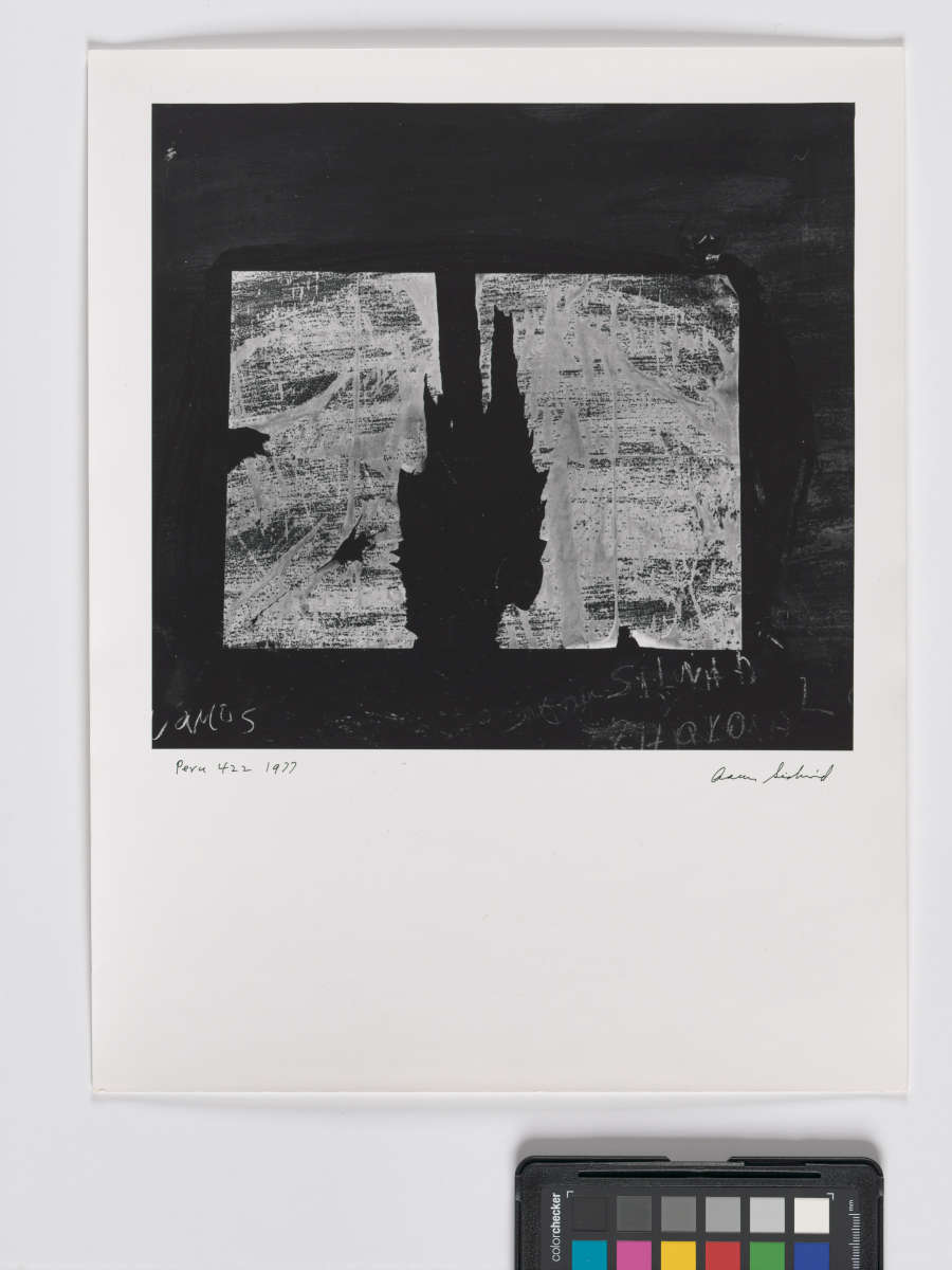 Signed in ink below image, LR corner: "Aaron Siskind"; in ink below image, LL corner: "Peru 422 1977". In pencil, verso, LC: "P422 3/77"; LL corner in matrix: "SILNAD 2HQYONAL"; LL corner: "AMOS"