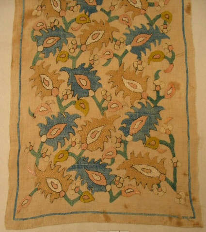 Linen, silk; plain weave, embroidery (atma stitch, double running stitch, satin stitch)