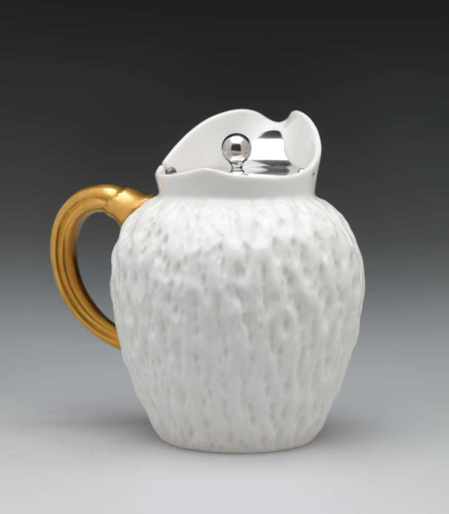 Stamped on the base: H&H with eagle/ENGLAND/crown motif/COALPORT/A.D. 1759. Two silver lids are stamped: 2/H&H with eagle/9216 (round pitcher) and 1/H&H with eagle/9209