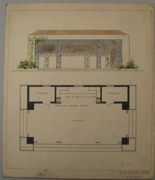 On recto in pencil: "1/4" SCALE", and in ink, "STORAGE / BAR & SERVING COUNTER / FOLDING LOUVRED DOORS / PORCH / STORAGE / PLANTING".