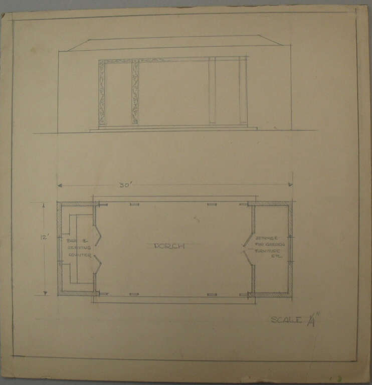 Plan and elevation (in pencil) of bar and serving counter, porch, storage for garden furniture, etc.