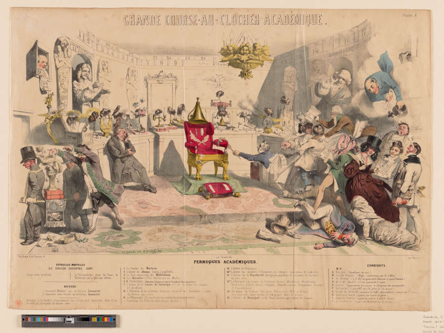 Lettered UC: "Grande Course-au-Clocher Academique"; and below image: "Chez Bauger R du Croissant 16 / par Grandville / Perruques Academiques / Imp. d'Aubert & Cie. / Depouilles Mortelles [...] pas de merite"