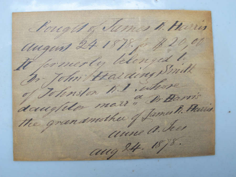 On bottom Label:Bought of James R. Harris August 24, 1878 for$20.00.It formerly belonged toDr. John Harding Smith of Johnston, R.I.whose daughter married Dr. Harris the grandmother of James R. Harris.Anne A. Ives, Aug. 24, 1878"