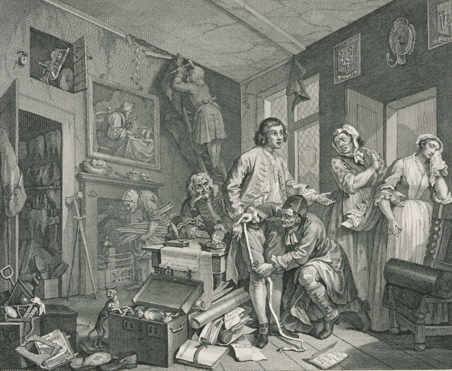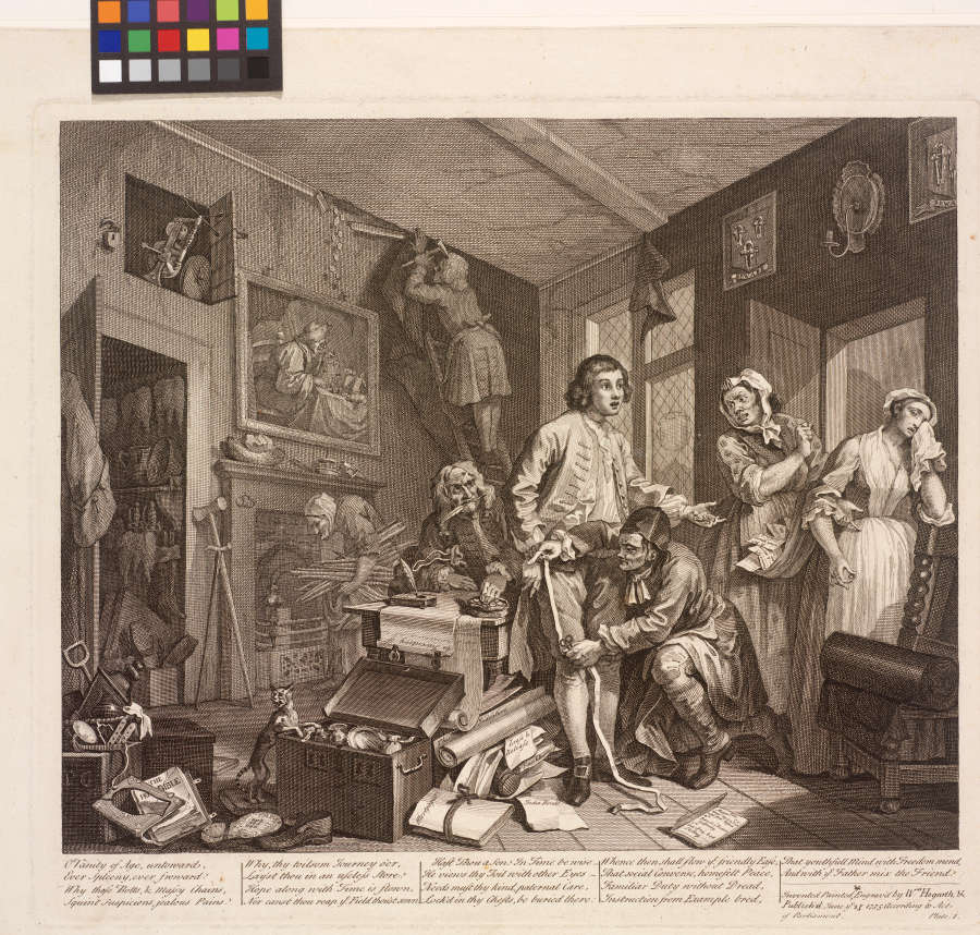 Original--Recto:In pencil inscribed, LR:IIIVerso:in pencil inscribed, center of right half of sheet:3rd State with the Bible at left/The tailor's bill has been removed from the roll of cloth. ; inscribed, LL:9.20.52 A-9/ColnaghiIn Plate--Inscribed, LR:Invented Painted & Engrav'd by W.m Hogarth, &/Publish'dJune y.e 25 1735.According to Act of Parliament.Plate.1. ; inscribed, bottom margin:O Vanity of Age, untoward,/Ever spleeny, ever froward!/Why those Bolts, & Massy Chains,/Squint suspicious, jealous Pains?|Why, thy toilsom Journey o'er,/Lay'st thou in an useless store?/Hope along with Time is flown,/Nor canst thou reap y.e Field thou'st sown.|Hast thou a Son?In Tie be wise-/He views thy Toil with other Eyes-/needs must thy Kind, paternal Care, Lock'd in thy Chests, be buried there:|Whence then shall flow y.t friendly Ease,/That social Converse, homefelt peace,/Familiar duty without Dread,/Instruction from Example bre