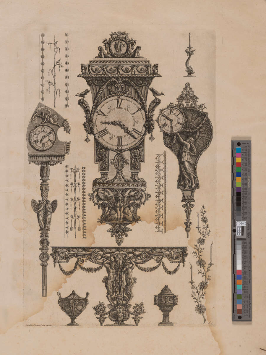 Plate 65: Miscellaneous furniture including three clocks and a console table