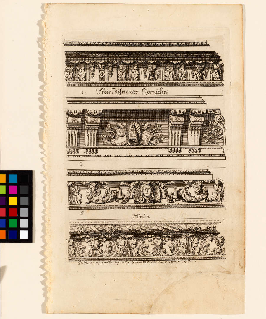 Lettered in image: "Trois Différentes Corniches"