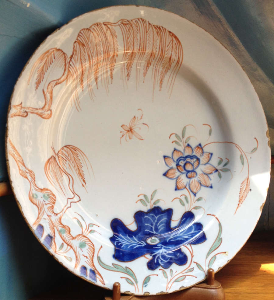 Stickers on reverse of plate: [White round sticker] "William & Gretchen Viall Collection." [White rectangle sticker] "Pictured in English Delftware/by Archer + Garner plate 71B. Discussed on page 36+38. Eleanor Monahon collection bought 12/19/91." [Small white sticker] "Lambeth/1740-50." [Yellow tape with printing] "MONAHON." Credit / Object Number