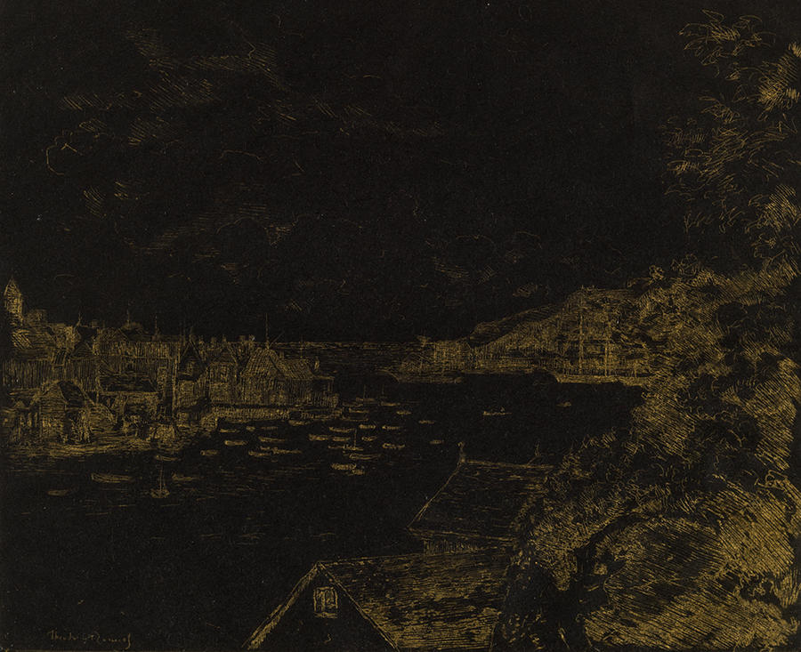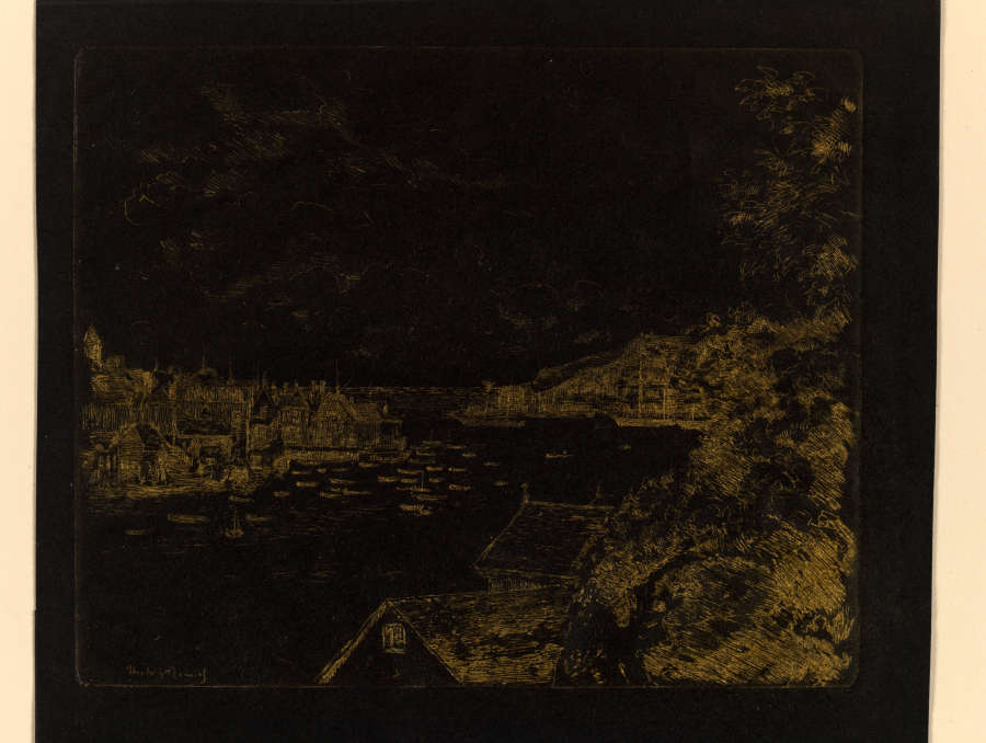 Etching printed in metallic gold ink on black-colored, slightly textured wove paper