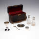 Marks: Each piece marked on silver: sterling and lion/anchor/gothic G; chalice has year mark for 1898 and code #85; paten year marked 1898, code #85; both bottles have code #1675 and GORHAM, no date mark; wafer box has year mark for 1898 code #785; spoon year marked for 1897, code #785