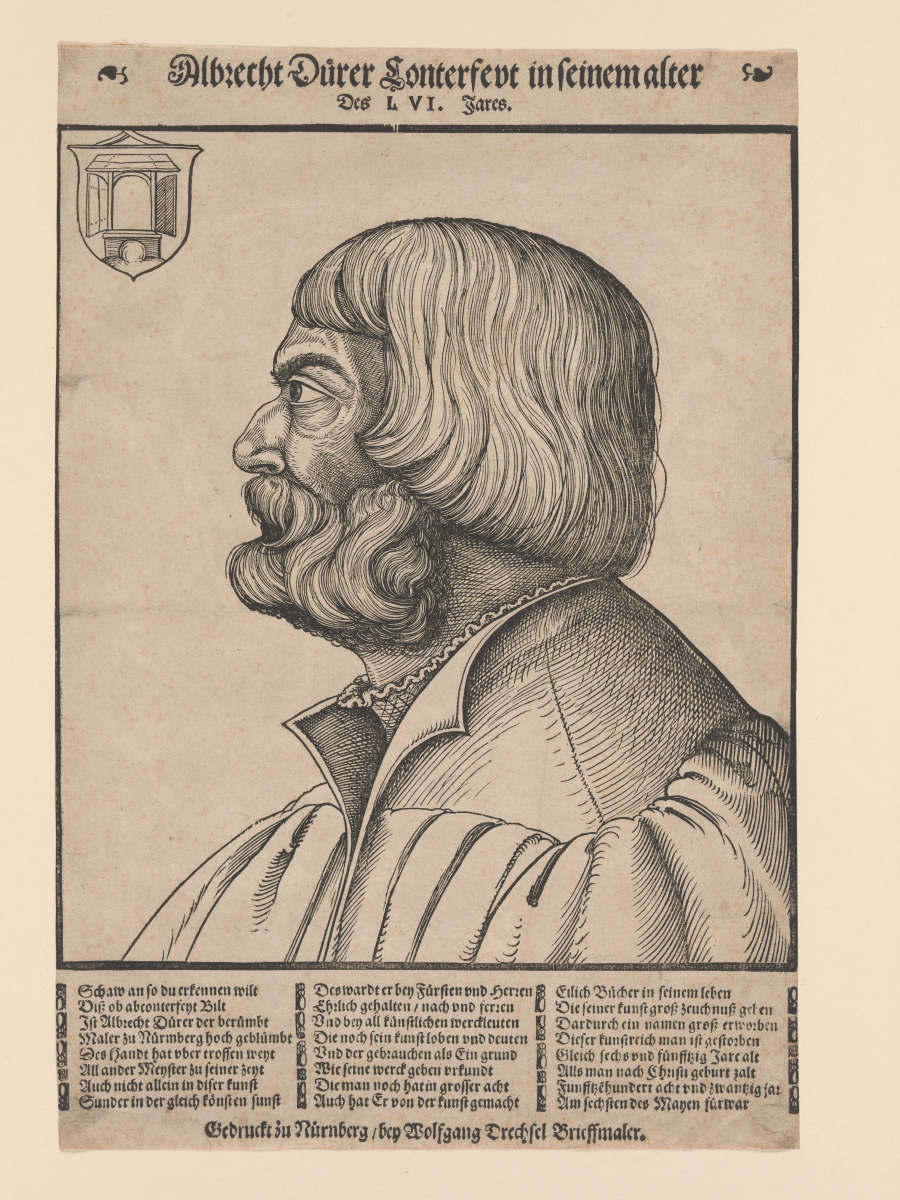Lettered UC, above the image: "Albrecht Durer Konterfeyt in seinem alter des LXI Jares"; and below image, LC, in letterpress: "Gedruckt zu Nurnberg bey Wolfgang Drechsel Brieffmaler."