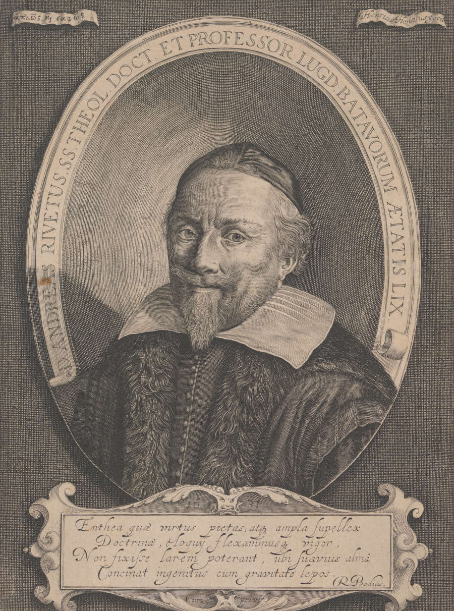 In Plate--Greek inscription in UL:(see print); inscribed in UR:Henrieus Honduis fecit; inscribed around portrait:D. ANDREAS RIVETUS. SS THEOL. DOCT. ET PROFESSOR LUGD. BARTAVORUM AETATIS LIX.; dated in LC:1631; (four line Latin inscription) in LC:Enthea qua virtus... inscribed along bottom edge edge center:Cum privil.