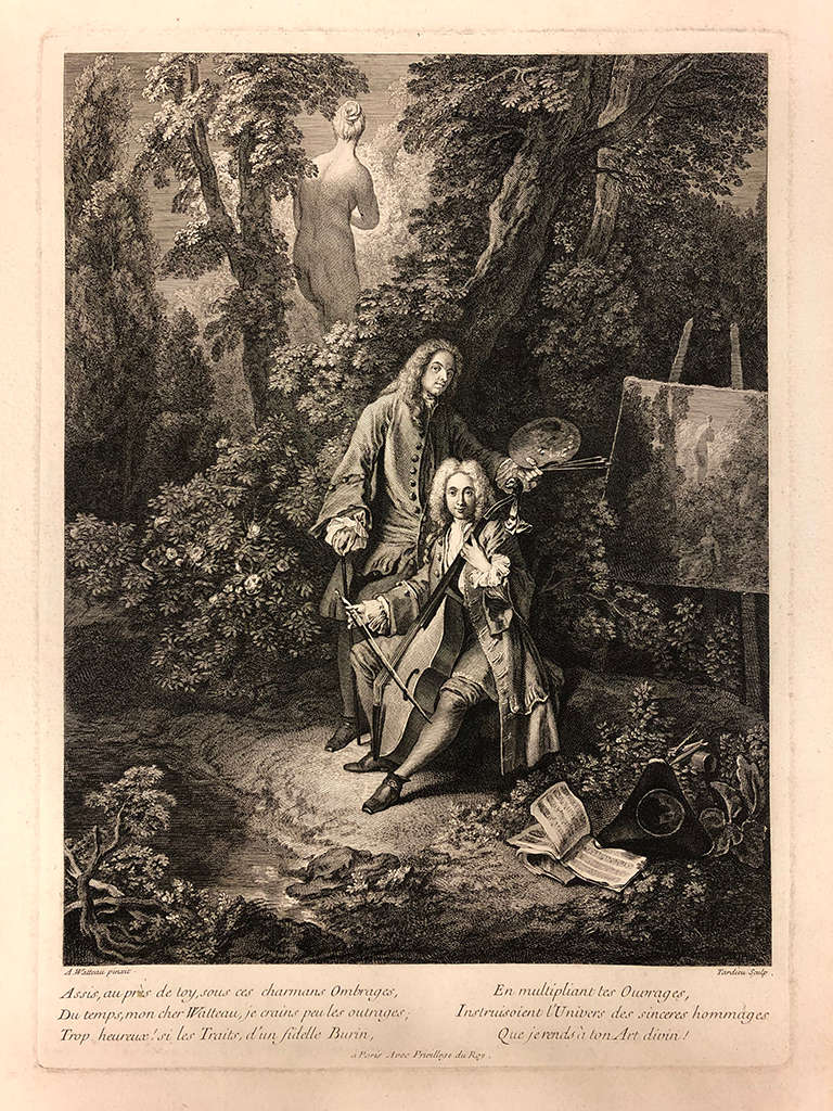 Lettered LL: "A. Watteau pinxit"; LR: "Tardieu sculp."; LC: "a Paris Avec Privilege du Roy"; and with six lines of verse in French: "Assis, au près...ton Art divin!"
