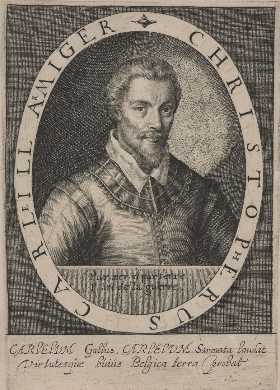 Original--Verso--inscribed in pencil in LR:3.50In Plate--Inscribed around portrait:CHRISTOPHERUS CARLEILL ARMIGER; inscribed in LL of Portrait oval:Par mer et par terre/Part de la guerre; inscribed below portrait:CARLELUM Gallus, CARLELUM Sarmata laudat/virtutesque huius Belgica terra