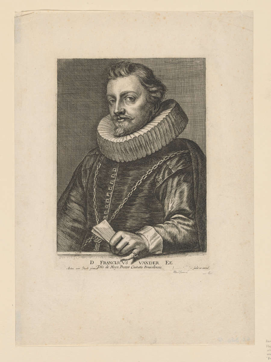 Recto:in pencil inscribed under platemark on right:Meissens-eIn Plate:Titled, LC:D. FRANCISCVS VANDER EE / Dns de Meys, Pretor Ciuitatis Bruxellensis; inscribed, LL:Anton van Dyck pinxit; in