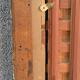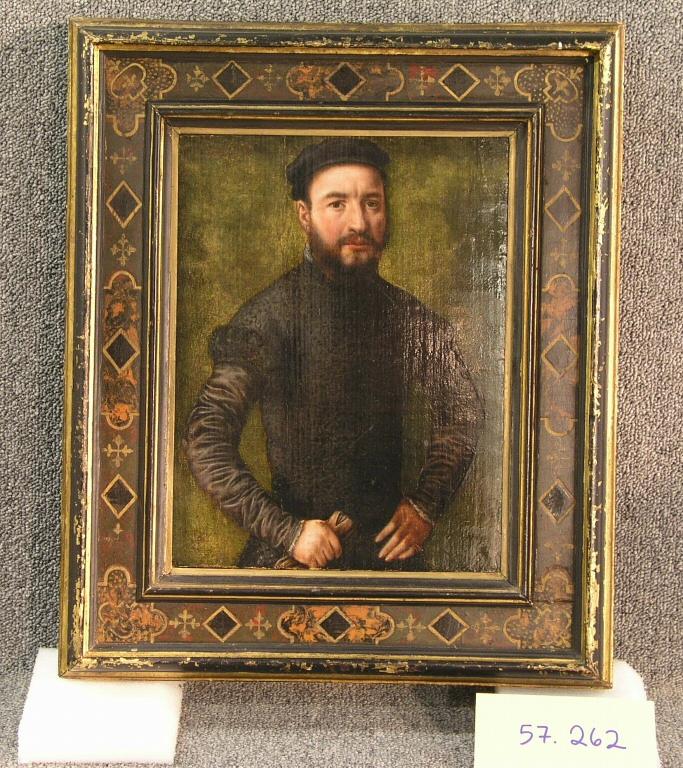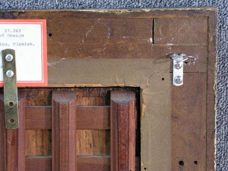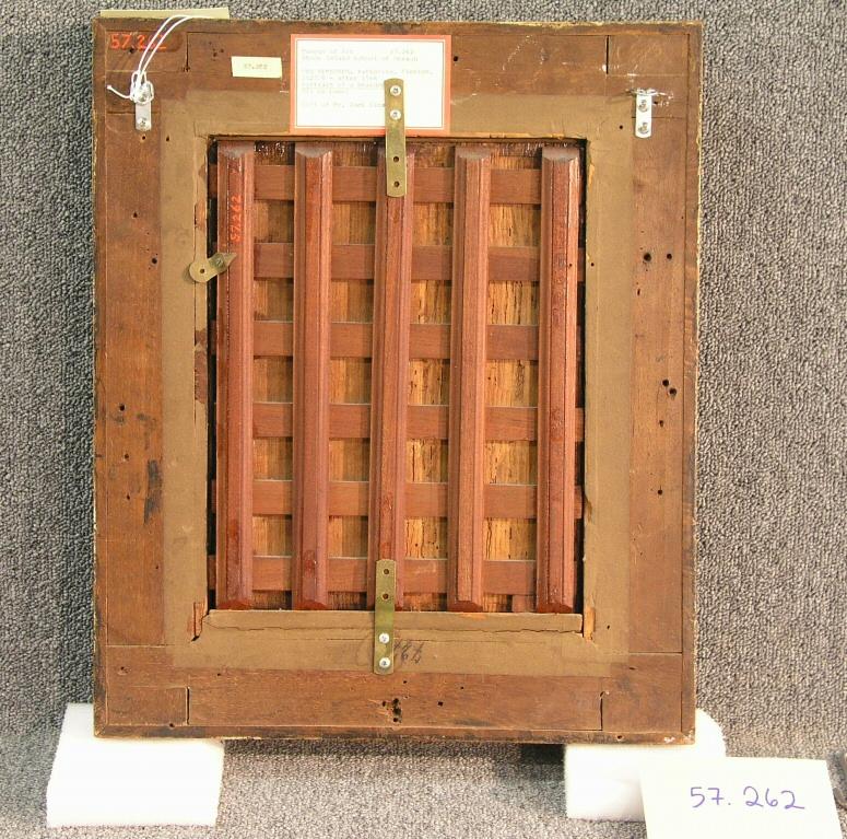 Marks: In the upper left corner of the back of the frame, the accession number "57.262" is written in red paint.In the upper right corner, there are the illegible white chalk markings.On center of the left edge of the frame, there is largely illegible graphite marking, possibly "B...J...M..."[?]In the upper left corner of the lattice brace, the accession number "57.262" is written in red paint.