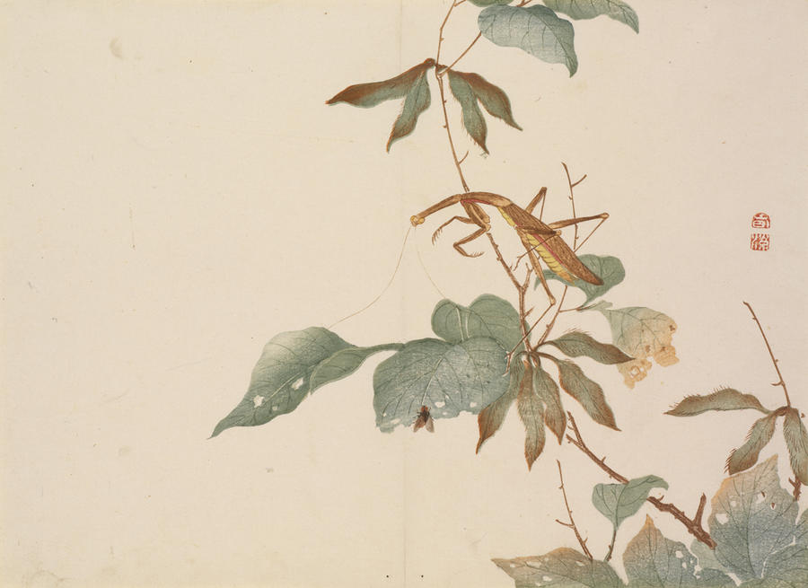 The first edition of the book: 1-vol. on Chinese-style paper with mica highlights on some sheets;illustrated book with 25 unnumbered sheets: 12 illustrations printed in color + 11 sheets of calligraphy; preface signed Shohitsu and dated 1820.7; engraver Tani Seiko; seal Edo; sheet 24 signed and dated Shigehisa Mori (1915-1957) (Chicago) (sold American Art Galleries, New York, 1926) Shunkei, spring/summer 1820 + name of engraver and printer Tobu Tani Seiko, sealed hori (engraver); this page is not included in the 3 later editions of the book nor in the 1905 reprint. The reprint has the title Churui gafu (Insect album) and the 1905 facsimile the title Shunkei gafu (per Hillier) with plates bearing the artist's name and without sheets of calligraphy. See Xeroxed refs. in cat. file.This sheet is sheet 18 from one of the later editions of the original book confirmed in correspondence between Roger Keyes and Deborah Del Gais in cat. file. Credit / Object Number