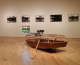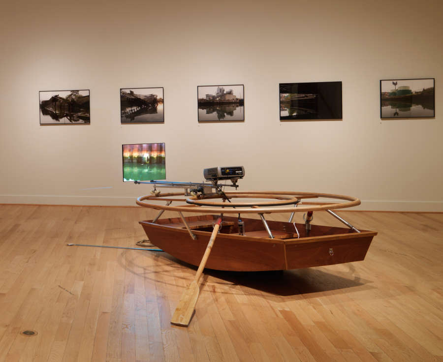Wood boat, mechanical system, video projection, wall drawing, color photographs by Poppy de Villeneuve