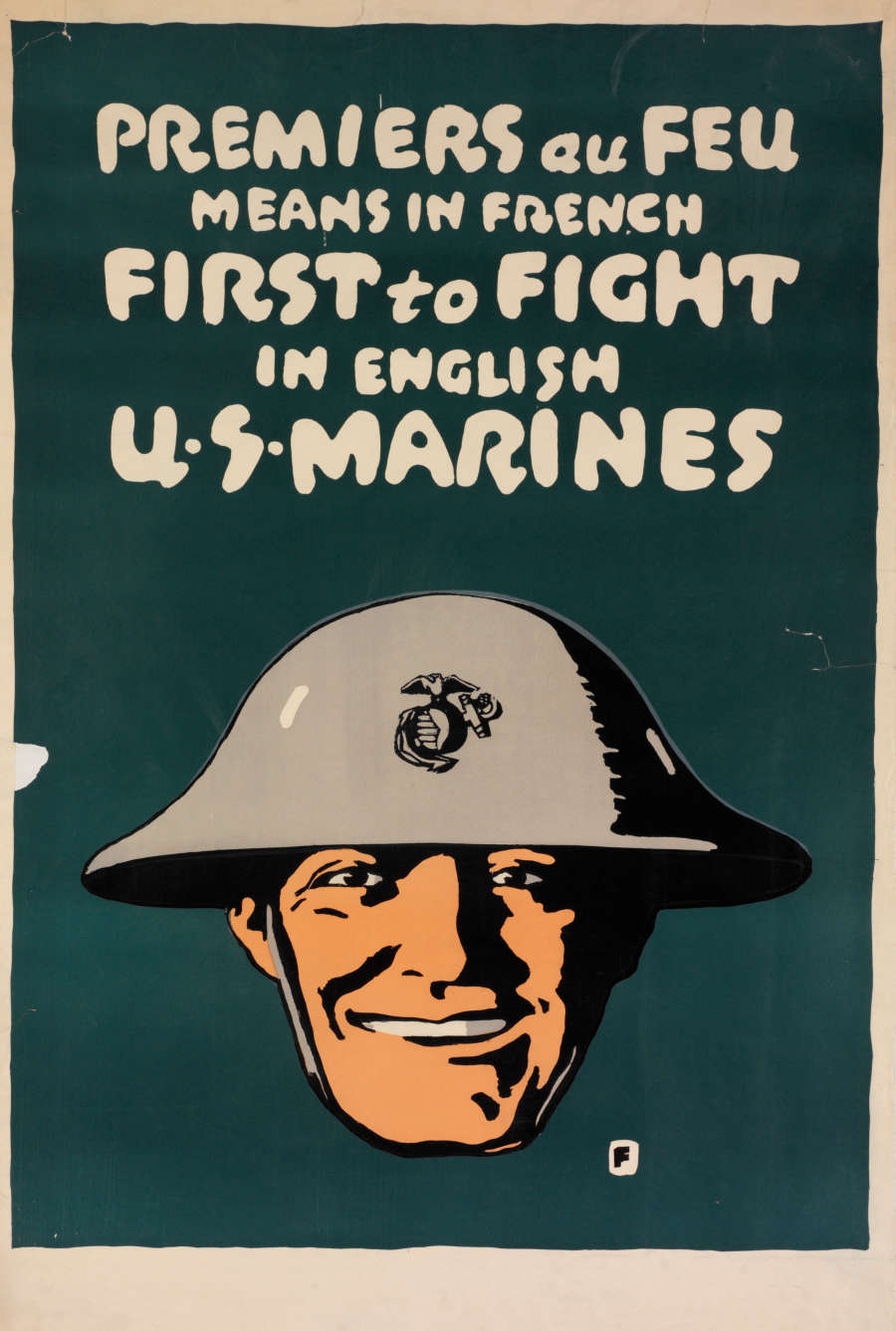 Aritst initial printed in image LR corner: "F"; title printed in upper half: "PREMIERS au FEU/ MEANS IN FRENCH/ FIRST to FIGHT/ IN ENGLISH/ U. S. MARINES"
