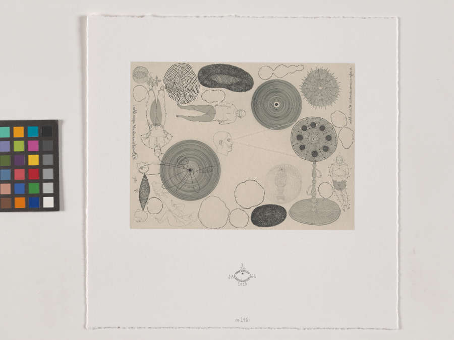 Stamp bearing artist name on lc flanked by 8/20 above "JA" to the left "SL" to the right and 2013 below inscribed in graphite. Inscribed in graphite "M.286." lc edge