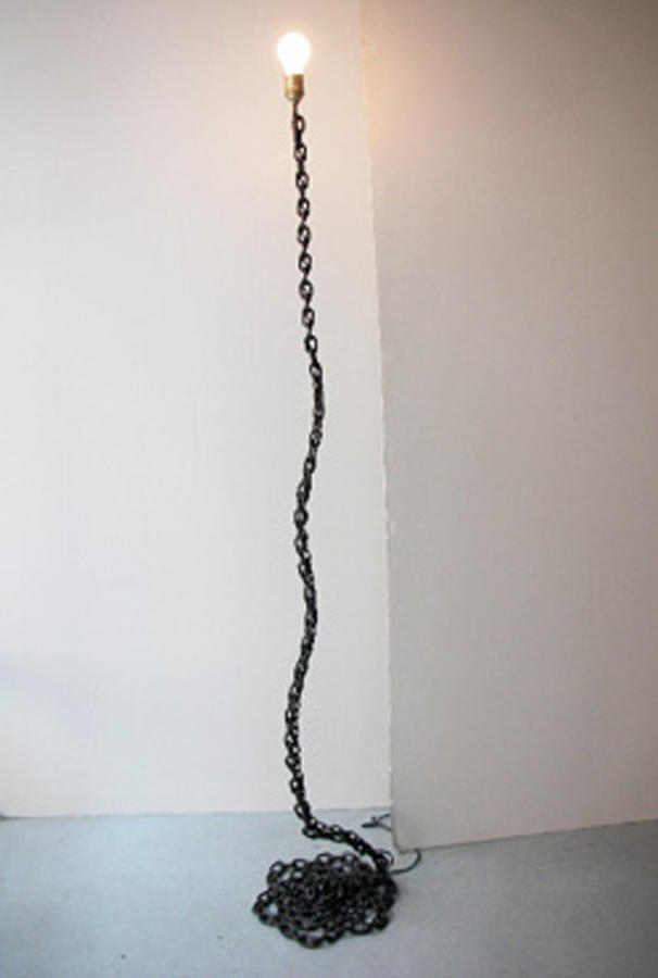 Iron chain, electrical cord, and light bulb