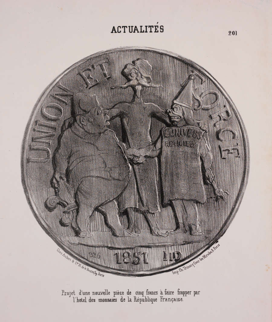 Printed, on image, around circle: Union Et Force/ 1851/ HD; Printed, on plate, UC: Actualites/ 201; Printed, on plate, LL: Chez Aubert & Cie Pl de la Bourse 29 Paris; Printed, on plate, LR: Imp Ch Trinocq Cour des MIracles 9 Paris; Printed, on plate, LL to LR: Projet d'une Nouvelle Pièce de Cinq; Inscriptions in graphite across bottom border of sheet