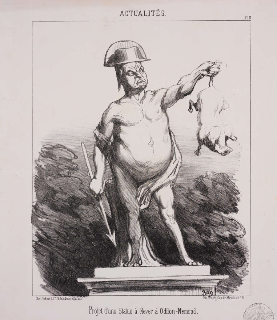 Printed, on plate, UC: Actualites./ 178.; Printed, on plate, LL: Chez Aubert & Cie Pl de la Bourse 29 Paris; Printed, on plate, LR: Lith Trinocq Cour des Miracles No 9.; Printed, on plate, LC: Projet d'une statue à élever à Odilon-Nemrod.; Inscriptions in graphite on sheet at lower border; Timbre National stamp on sheet at LR