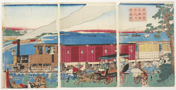 Prospering Tokyo: Steam Engine, Horse and Carriages, and Rickshaw (Tokyo jōkisha basha jinriki hanei zu)