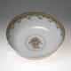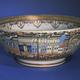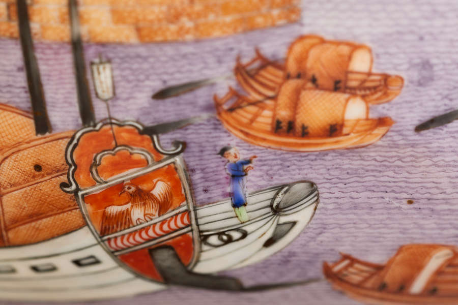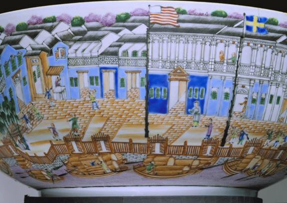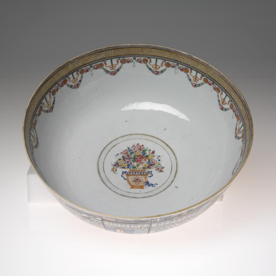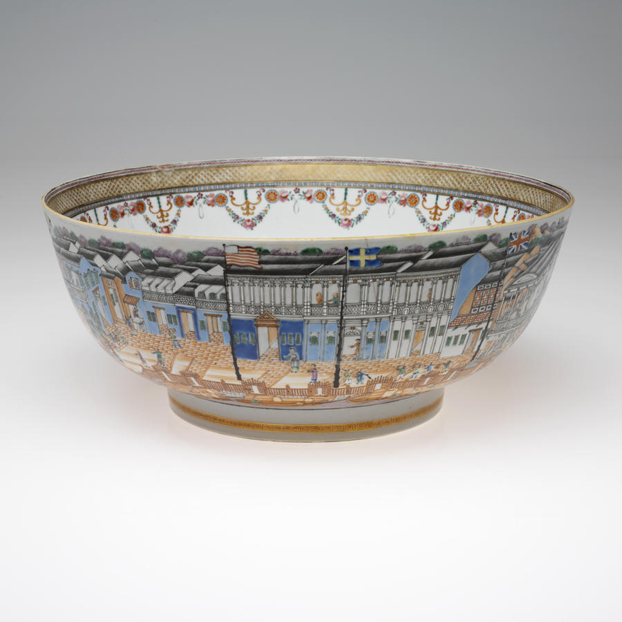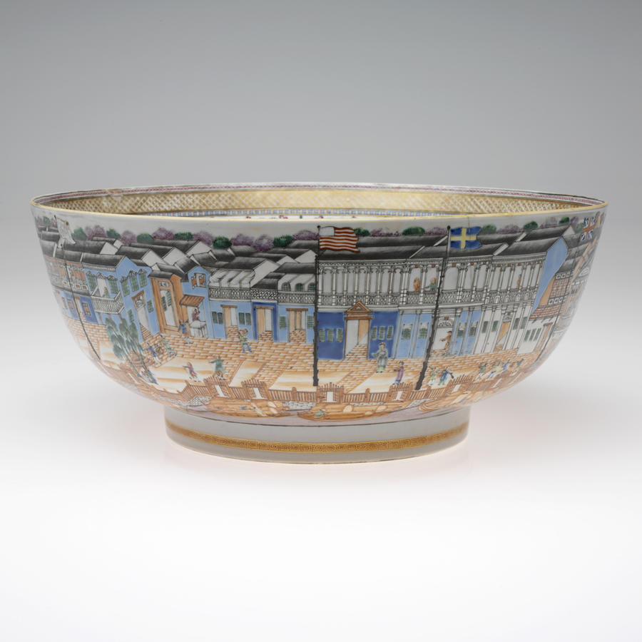 Elizabeth A. Williams, Curator of Decorative Arts and Design: This bowl is both a physical product and pictorial documentation of 18th-century global commerce. It depicts the Canton waterfront, where an American flag flies high among those of European countries including England, France, and Holland, heralding the United States’ successful international trade with China beginning in 1784. A series of buildings known as hongs encircles the bowl’s exterior. Operated by Western nations, hongs served as storehouses for the China trade, a lucrative venture that brought tea, silks, porcelain, lacquerware, and other luxury articles to Western shores.