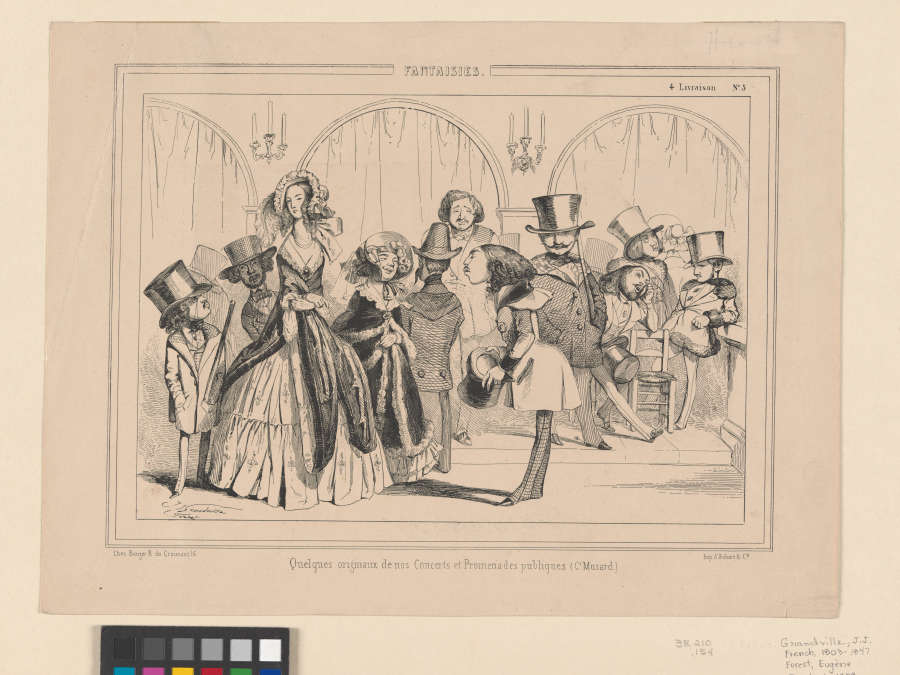 In Plate--In UC:FANTAISIES.; in UR:4 Livraison Nº.5; signed, LL:J.J. Grandville E. Forest; in LL:Chez Bauger R du Croissant 16; titled, LC:Quelques originaux de nos Concerts et Promenades publiques [C.(cross superscribed) Musard.]; in LR:Imp. d'Aubert & Cie.(ie superscribed)