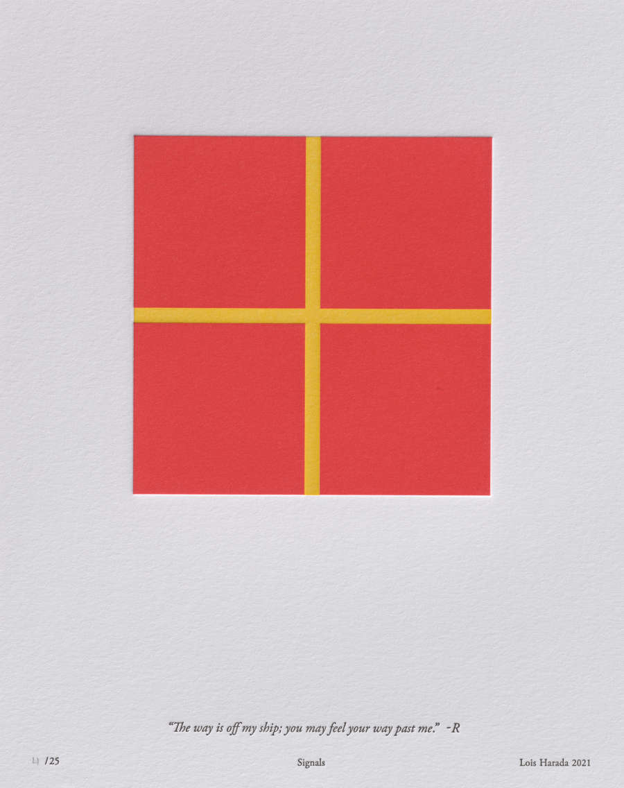 On recto, “4” inscribed in graphite LL within line printed in black ink at bottom that reads “/25 Signals Lois Harada 2021”