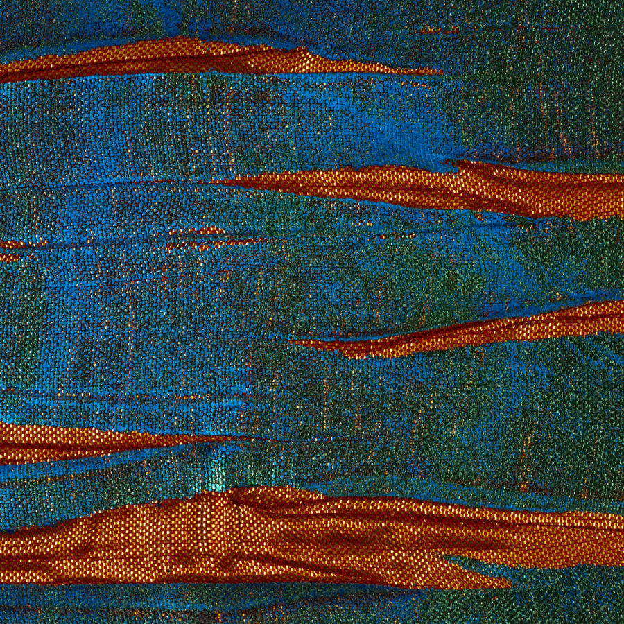 Plain woven ground cloth with a metallic transfer print; textile appears to have been pleated before printing