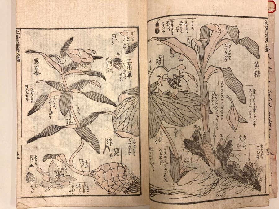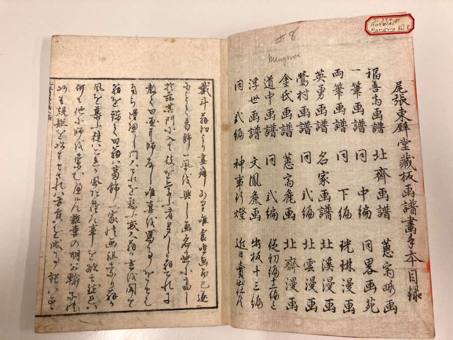 Inscription on inside of front cover, top left, in pencil:#8/MangwaOctagonal label adhered to inside of front cover, top right with inscription in ink: 31.394(.8)/Hokusai/Mangwa Vol. 8