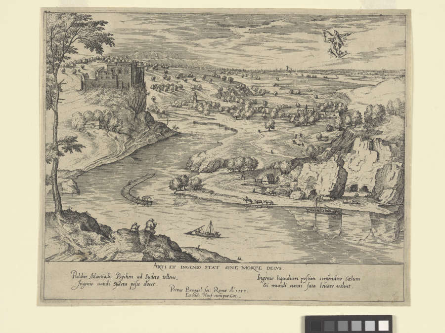 Verso in pencil in LL:1505/75; in brown ink in center of left edge:mon/135 45In plate--In LC:ARTI ET INGENIO STAT SINE MORTE DECVS.; in LC on bottom:Petrus Breughel fec:Romae A°: 1553-/Excud