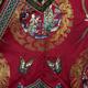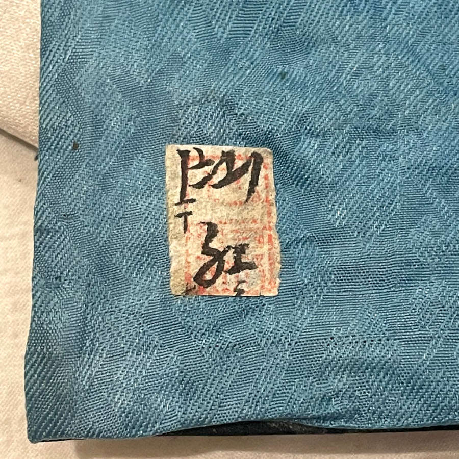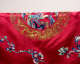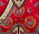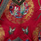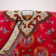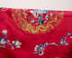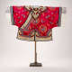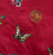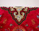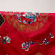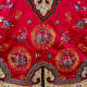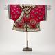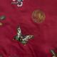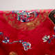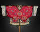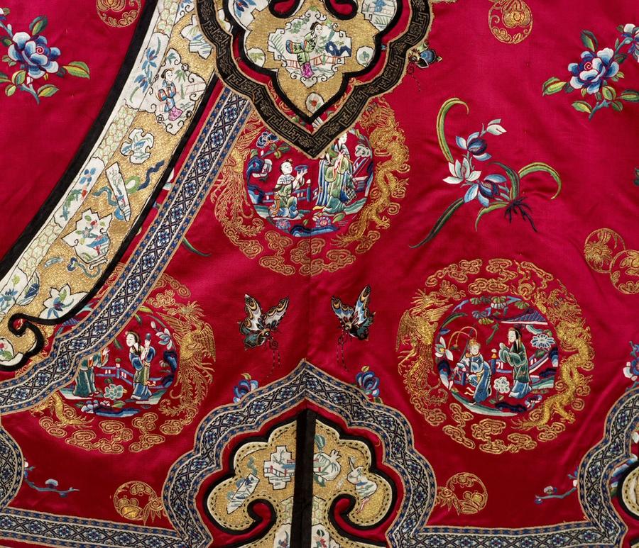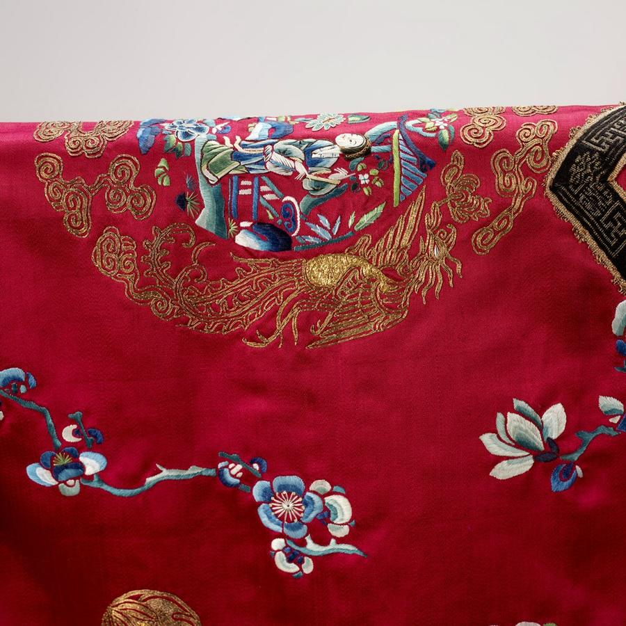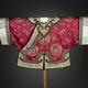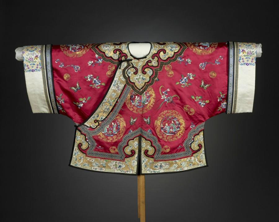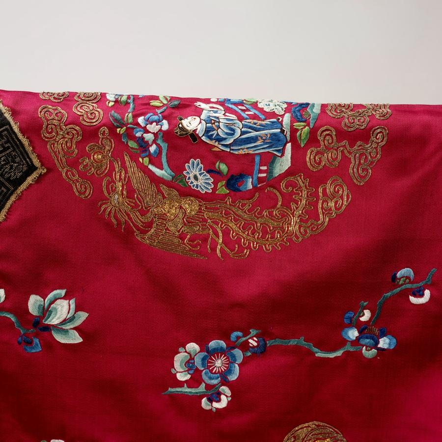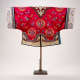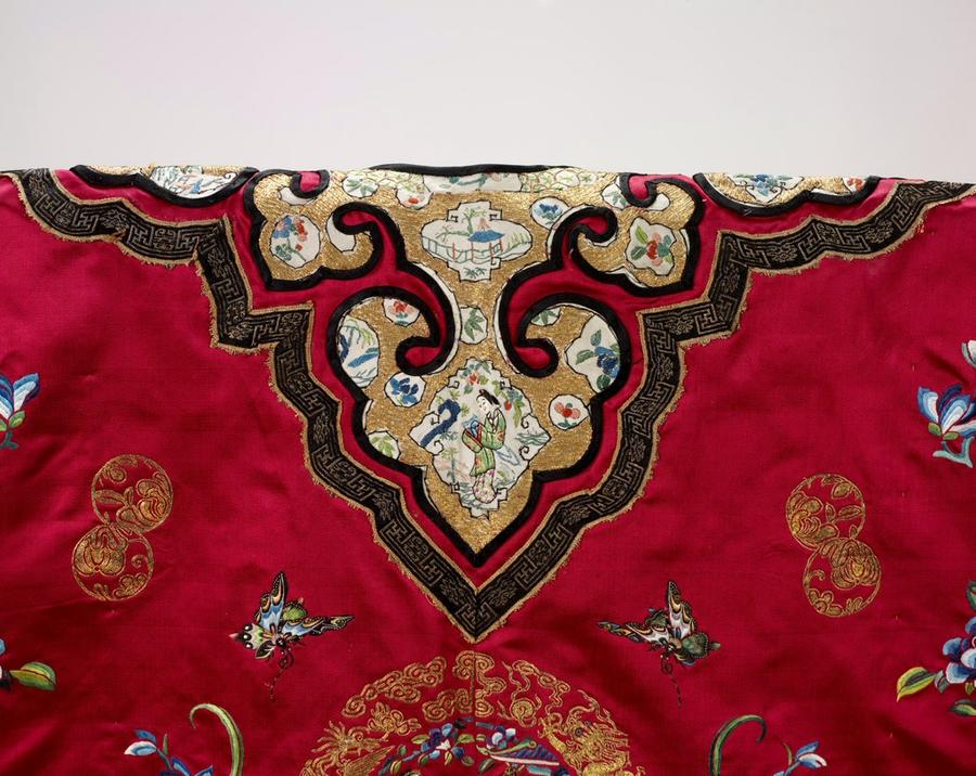 Silk satin weave with silk and wrapped-metallic embroidery; applied silk satin sleeve bands and ribbon trim (huataozi)