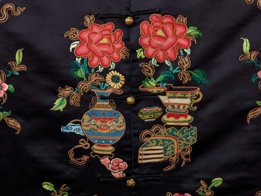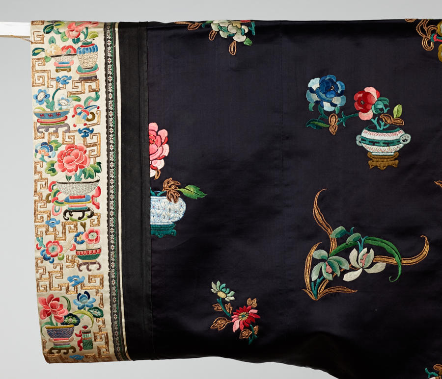 Silk satin weave with metallic and silk embroidery and applied ribbon (huataozi)