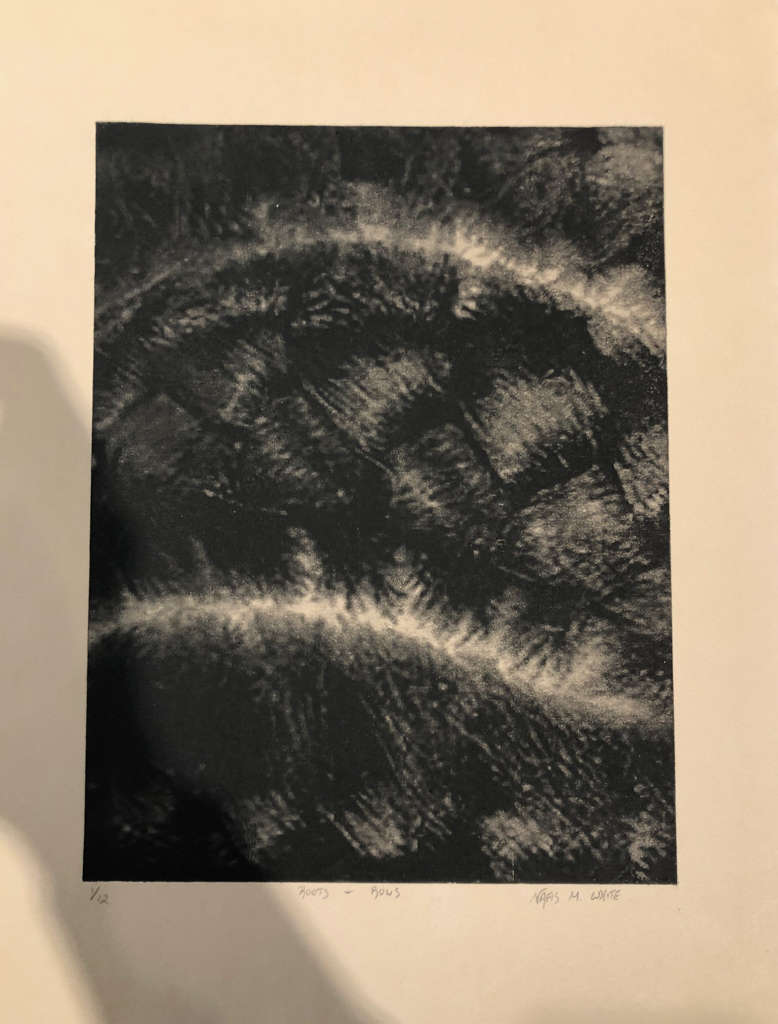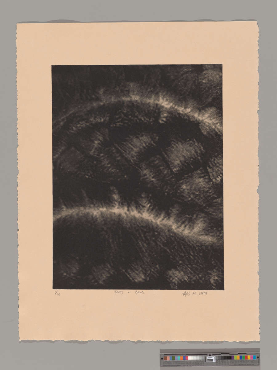 Inscribed and signed on graphite on bottom of image on recto: 1/12 Roots + Rows Nafis M. White. B inscribed on recto UR.
