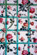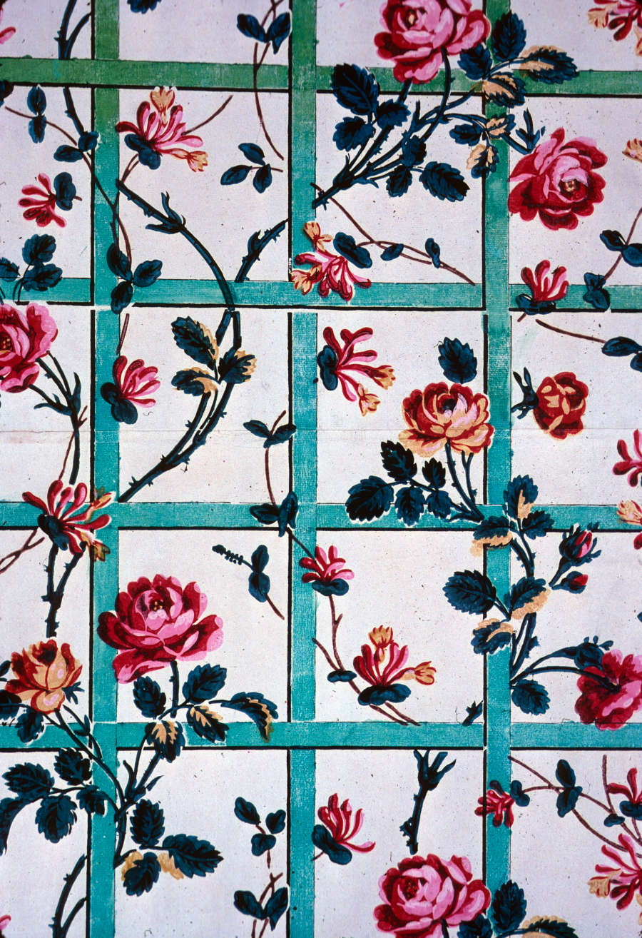 • Panel of vintage wallpaper with a classic floral pattern featuring rows of roses in pink and orange hues, intersected by geometric green trellis designs on a pale yellow background.