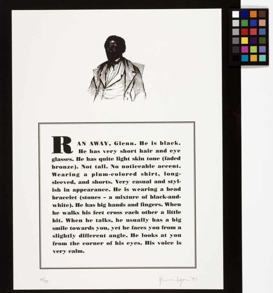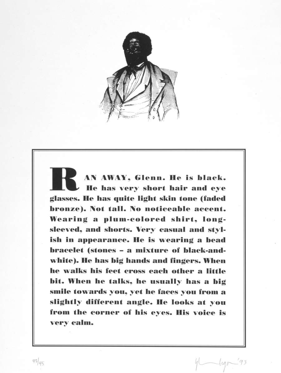 edition inscribed in pencil LL corner:"45/45".Signed and dated in pencil LR corner, "Glenn Ligon '93"