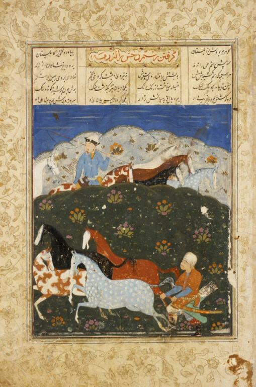 Title in red: Rostam is capturing Rakhsh from the herd ( Gereftane Rostam Rakhsh Ra Az Rameh گرفتن رستم رخش را از رمه)