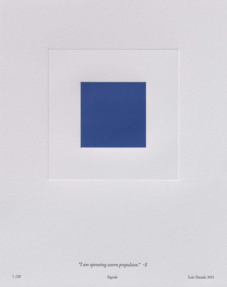 On recto, “4” inscribed in graphite LL within line printed in black ink at bottom that reads “/25 Signals Lois Harada 2021”