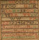 At upper, uppercase alphabet with each letter being repeated twice in a row, numbers 1-9; maker's mark and dated at bottom: "Martha D Prior Her y z/Sampler Made In The 6th/Year Of Her Age 1795"; lowercase alphabet below with "x y z" being fit in at ends of prior lines.