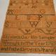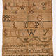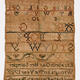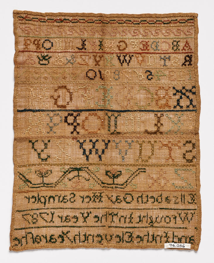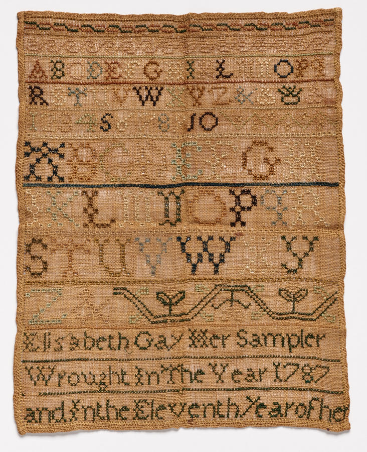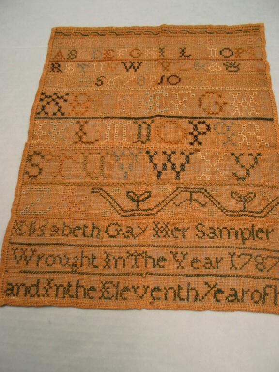 At upper: uppercase alphabet including ampersand, numers 1-10, large uppercase alphabet including ampersand; maker's mark and date at bottom: "Elisabeth Gay Her Sampler/Wrought In The Year 1787/and In the Eleventh Year of her"