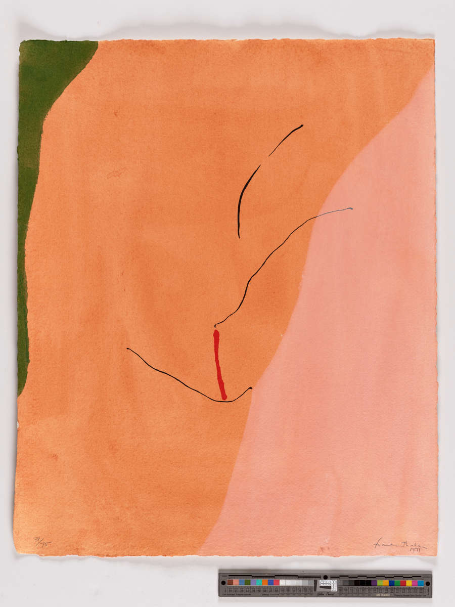 LL in graphite: 34/75; LR: Frankenthaler 1971. Verso: center in black ink stamp: "SANGUINE MOOD"/POCHOIR EDITION-75; LR G33011
