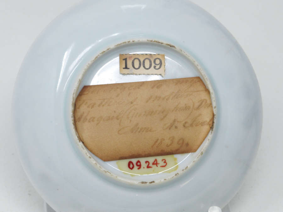 Old label on Cup:"Brought out from Scotland by Gideon Crawford, A. A. Ives' maternal ancestor."Old label on Saucer:"Belonged to my father's mother, Abigail (Cunningham) Dorr.Anne A Ives. 1839"