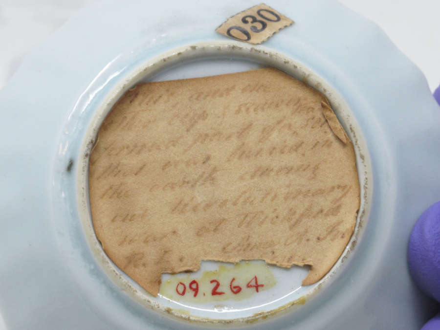 Old label:"This and one other cup and saucer, formed part of a tea set that was buried in the earth during our Revolutionary War at Wickford, R.I. "Anne A. Ives.Bought Sept. 1842